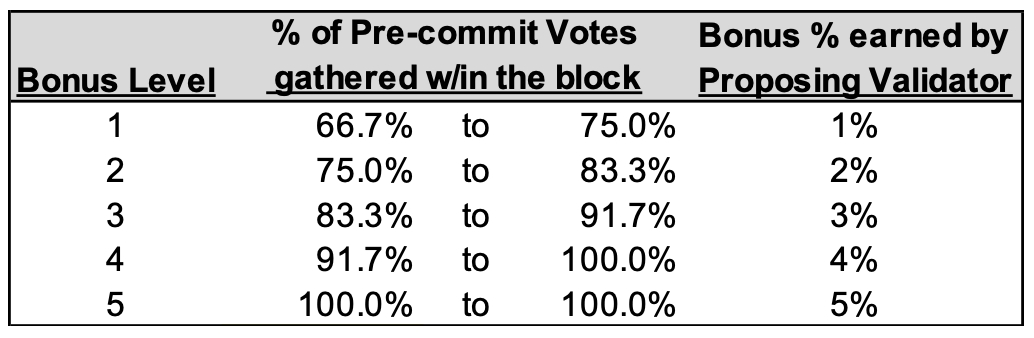 The bonus rewards for the block proposer are calculated based on the following table . These calculations are independant of Block Rewards . The Bonus reward is payed out to further incentives the block proposing validator.